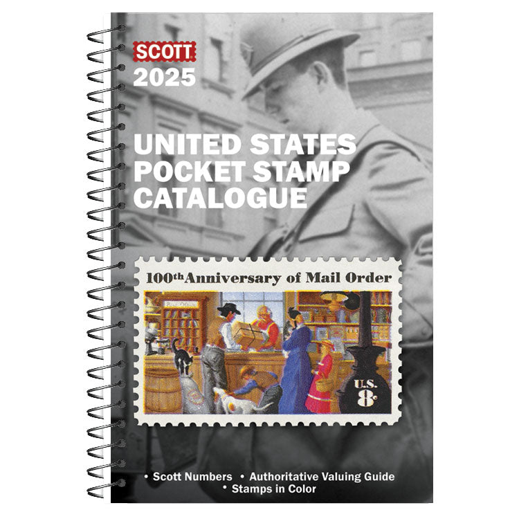 For collectors on the go, the Scott United States Pocket Stamp Catalogue offers the ease of lightweight portability combined with essential listing information and values for more than 6,000 postage stamps and selected back-of-the-book issues. The 2025 edition has been revamped to display crisp, full-color illustrations with Scott numbers and descriptions below. Handy checkboxes appear alongside catalogue values for unused and used varieties. The 2025 Scott United States Pocket Stamp Catalogue makes it easy to keep track of what you have and what you need, whether you’re at a show, perusing a dealer’s website, or relaxing at your stamp desk at home. This special pocket catalogue contains United States Postage Stamps, Semi-Postal Stamps, Air Post Stamps, Air Post Special Delivery Stamps, Special Delivery Stamps, Registration Stamp, Certified Mail Stamp, Postage Due Stamps, U.S. Offices in China, Official Stamps, Newspaper Stamps, Parcel Post Stamps, Parcel Post Postage Due Stamps, Special Handling Stamps, Computer Vended Postage. Personal Computer Postage, Non-Personalizable Postage, Carriers’ Stamps, and Hunting Permit (Duck) Stamps.